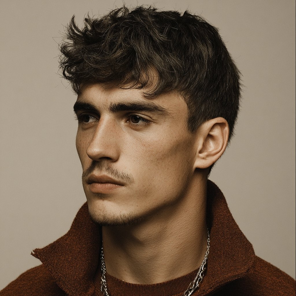 This modern style features short sides and choppy, textured layers on top. The texturing technique removes bulk and creates natural separation, giving hair a piecey, lived-in appearance that’s both stylish and effortless. Perfect for men who want a contemporary look without the daily styling commitment of more structured cuts.