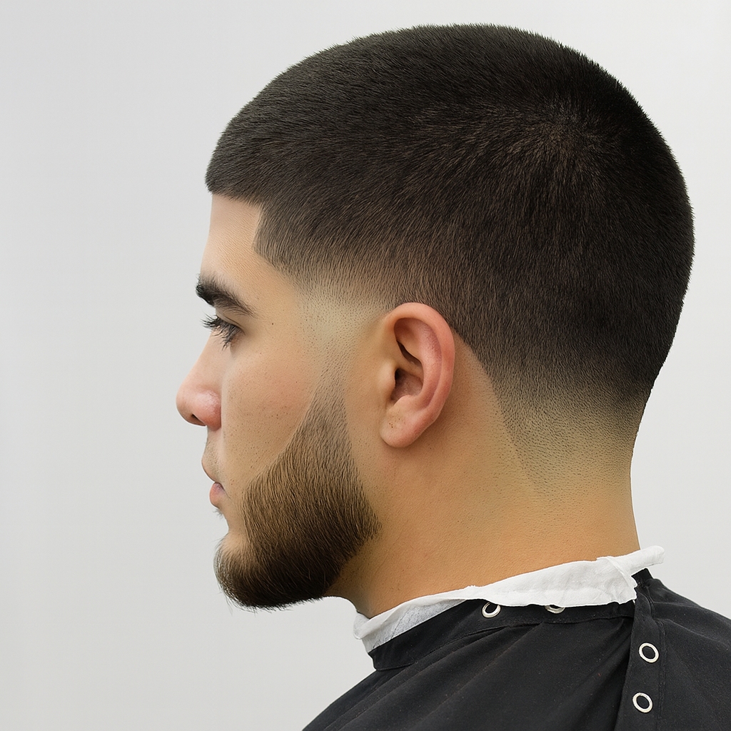 The buzz cut offers the perfect blend of simplicity and precision, featuring uniformly short hair on top with a clean, low-maintenance appearance. The low taper fade adds modern edge while keeping the overall look crisp and professional.