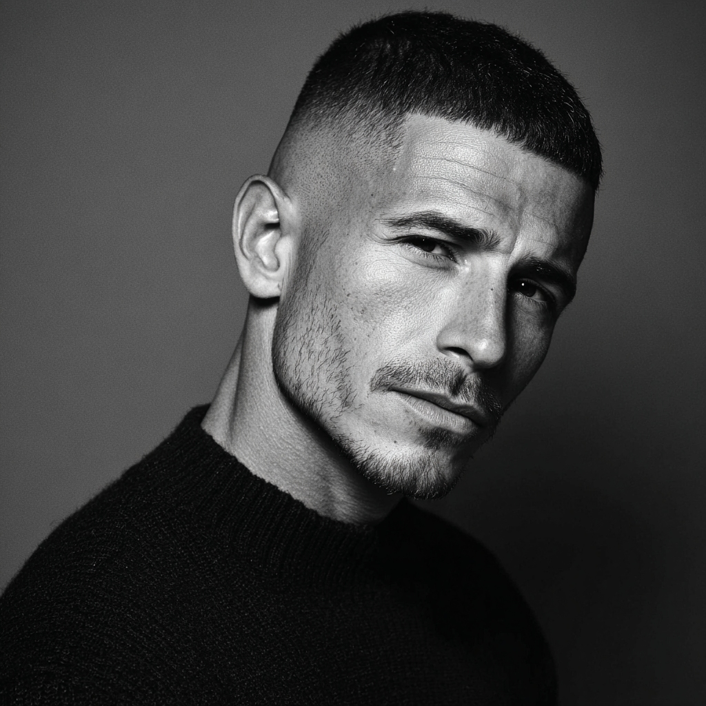 Laterales muy cortos y zona superior mínima. Más definido que el rapado pero igual de práctico. Resalta mandíbula y barba.